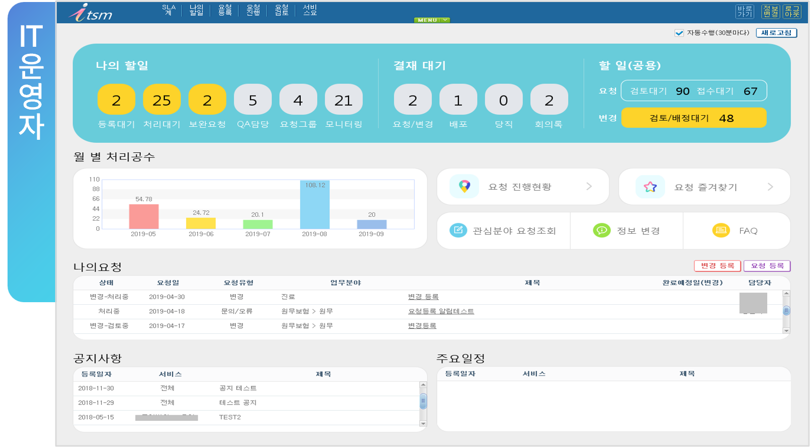 - 최근 1년간의 요청유형(문의•오류•개발 등)별 IT운영자의 처리시간 및 추이 확인 가능